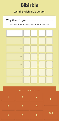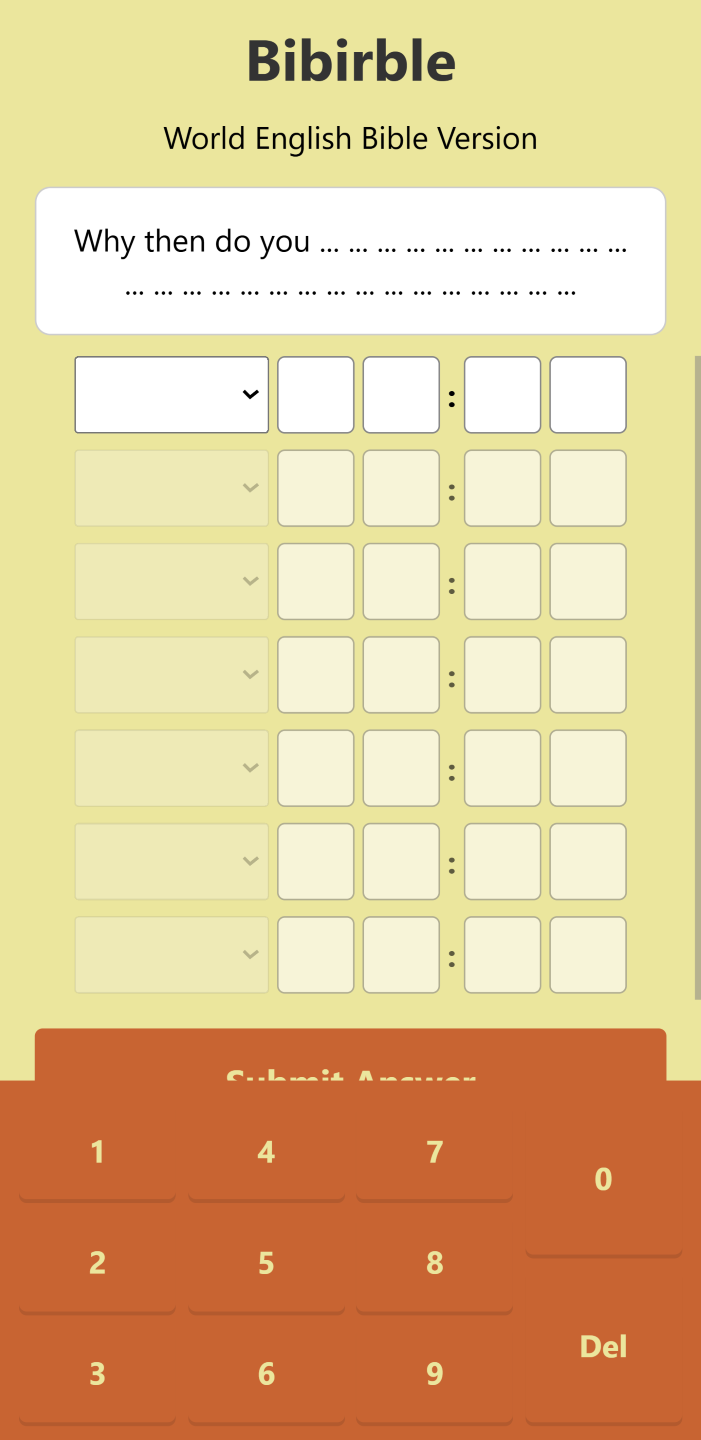 Hello there, Bibirble is my latest game. It is like, if Wordle had a baby with the Holy Bible (figuratively not literally). Hope you enjoy.